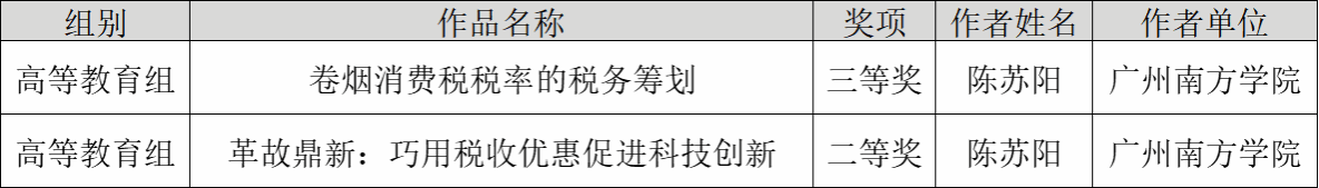 陈苏阳老师提交的课程案例《革故鼎新:巧用税收优惠促进科技创新》紧扣时代主题,将国家税收政策与企业科技创新实践有机融合,通过智慧教育平台实现教学内容的可视化、互动化与情境化,荣获“信息化教学课程案例”类高等教育组二等奖;课件作品《卷烟消费税税率的税务筹划》以清晰的逻辑结构、丰富的数字资源和实用的教学设计,获得“常规课件”类高等教育组三等奖。两项获奖成果不仅体现了陈苏阳老师在课程设计与数字资源开发方面的创新能力,也彰显了我校教师在信息技术与专业教学深度融合中的积极探索与实践水平。