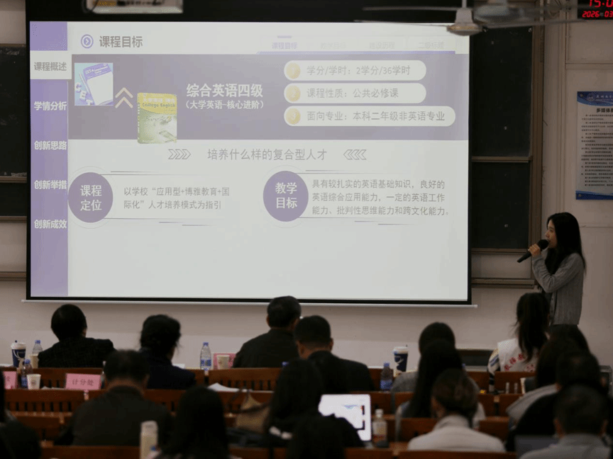 本届大赛决赛采用“教学设计创新汇报+现场说课展示”的形式。参赛教师们聚焦课程内容重构、教学方法改革、特别是AI技术赋能教学、评价机制优化等方面的创新实践,全面展示了扎实的教学功底与积极的探索成效。
